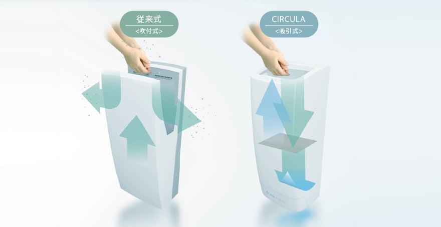 - CIRCULA has been developed as the only aspiration-type hand dryer all over the world and prevents the dispersion of waterdrops, miscellaneous fungal, viruses, etc. by 99.7% compared to conventional ones. ※1